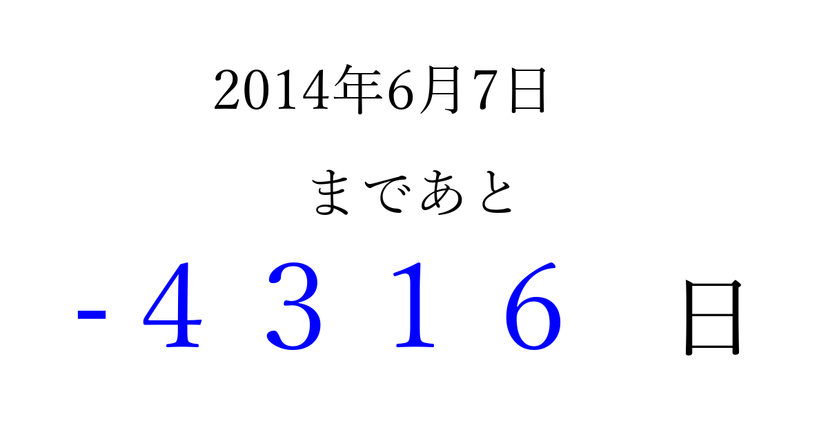 2014年6月7日(土)は もう 0000 日過ぎました 追加すると、トップページからすぐ選べるようになります ※2026/04/01現在の結果です。 最新の状態に更新する ↓シェアして、タイムライン上にカウントダウンを表示しよう!↓ 📤 この結果を共有する Tweet シェア Threads Bluesky 別の日付でカウントダウン 2014年6月のカレンダー このページをブックマークに追加すると、いつでもカウントダウンを確認できます。 (PC: Ctrl+D / Mac: ⌘+D) hitome-notes.comでは以下のページも運営しています。 指定日と期間から日付を計算 | ガチャ確率計算・シミュレーション | プライバシー・ポリシー 運営者:Avocado