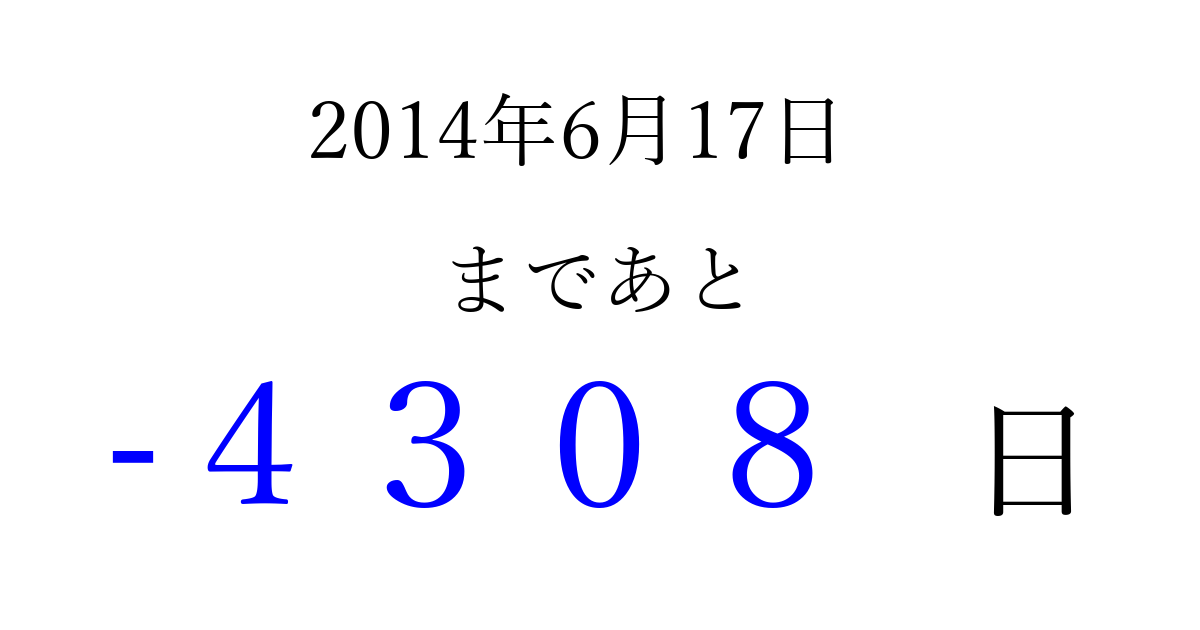 2014年6月17日(火)は もう 0000 日過ぎました 追加すると、トップページからすぐ選べるようになります ※2026/04/03現在の結果です。 最新の状態に更新する ↓シェアして、タイムライン上にカウントダウンを表示しよう!↓ 📤 この結果を共有する Tweet シェア Threads Bluesky 別の日付でカウントダウン 2014年6月のカレンダー このページをブックマークに追加すると、いつでもカウントダウンを確認できます。 (PC: Ctrl+D / Mac: ⌘+D) hitome-notes.comでは以下のページも運営しています。 指定日と期間から日付を計算 | ガチャ確率計算・シミュレーション | プライバシー・ポリシー 運営者:Avocado