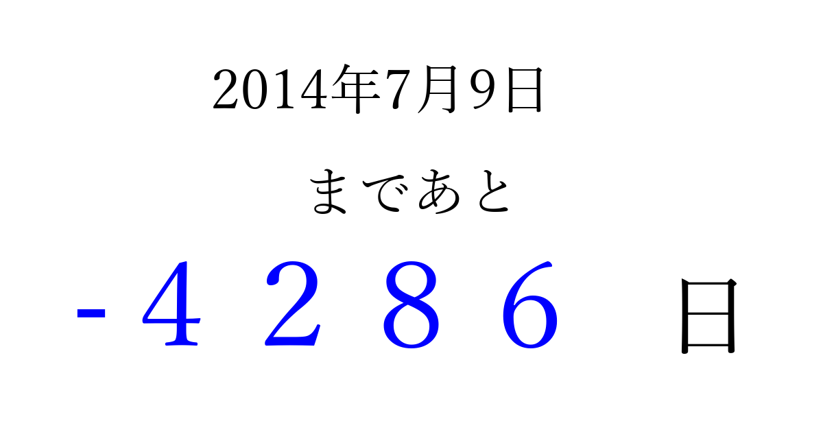 2014年7月9日(水)は もう 0000 日過ぎました 追加すると、トップページからすぐ選べるようになります ※2026/04/03現在の結果です。 最新の状態に更新する ↓シェアして、タイムライン上にカウントダウンを表示しよう!↓ 📤 この結果を共有する Tweet シェア Threads Bluesky 別の日付でカウントダウン 2014年7月のカレンダー このページをブックマークに追加すると、いつでもカウントダウンを確認できます。 (PC: Ctrl+D / Mac: ⌘+D) hitome-notes.comでは以下のページも運営しています。 指定日と期間から日付を計算 | ガチャ確率計算・シミュレーション | プライバシー・ポリシー 運営者:Avocado