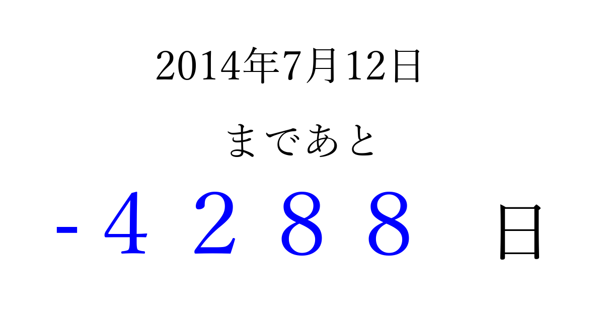 2014年7月12日(土)は もう 0000 日過ぎました 追加すると、トップページからすぐ選べるようになります ※2026/04/08現在の結果です。 最新の状態に更新する ↓シェアして、タイムライン上にカウントダウンを表示しよう!↓ 📤 この結果を共有する Tweet シェア Threads Bluesky 別の日付でカウントダウン 2014年7月のカレンダー このページをブックマークに追加すると、いつでもカウントダウンを確認できます。 (PC: Ctrl+D / Mac: ⌘+D) hitome-notes.comでは以下のページも運営しています。 指定日と期間から日付を計算 | ガチャ確率計算・シミュレーション | プライバシー・ポリシー 運営者:Avocado