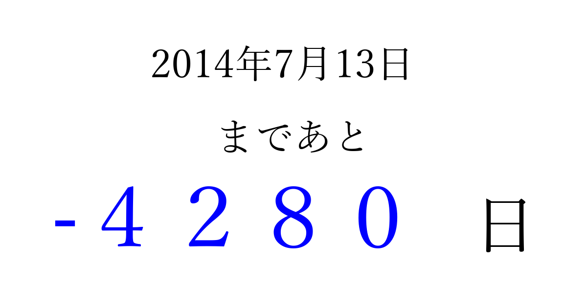 2014年7月13日(日)は もう 0000 日過ぎました 追加すると、トップページからすぐ選べるようになります ※2026/04/01現在の結果です。 最新の状態に更新する ↓シェアして、タイムライン上にカウントダウンを表示しよう!↓ 📤 この結果を共有する Tweet シェア Threads Bluesky 別の日付でカウントダウン 2014年7月のカレンダー このページをブックマークに追加すると、いつでもカウントダウンを確認できます。 (PC: Ctrl+D / Mac: ⌘+D) hitome-notes.comでは以下のページも運営しています。 指定日と期間から日付を計算 | ガチャ確率計算・シミュレーション | プライバシー・ポリシー 運営者:Avocado