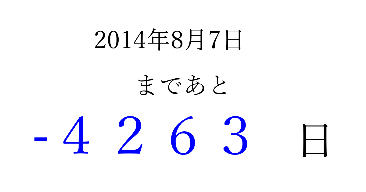 2014年8月7日(木)は もう 0000 日過ぎました 追加すると、トップページからすぐ選べるようになります ※2026/04/09現在の結果です。 最新の状態に更新する ↓シェアして、タイムライン上にカウントダウンを表示しよう!↓ 📤 この結果を共有する Tweet シェア Threads Bluesky 別の日付でカウントダウン 2014年8月のカレンダー このページをブックマークに追加すると、いつでもカウントダウンを確認できます。 (PC: Ctrl+D / Mac: ⌘+D) hitome-notes.comでは以下のページも運営しています。 指定日と期間から日付を計算 | ガチャ確率計算・シミュレーション | プライバシー・ポリシー 運営者:Avocado