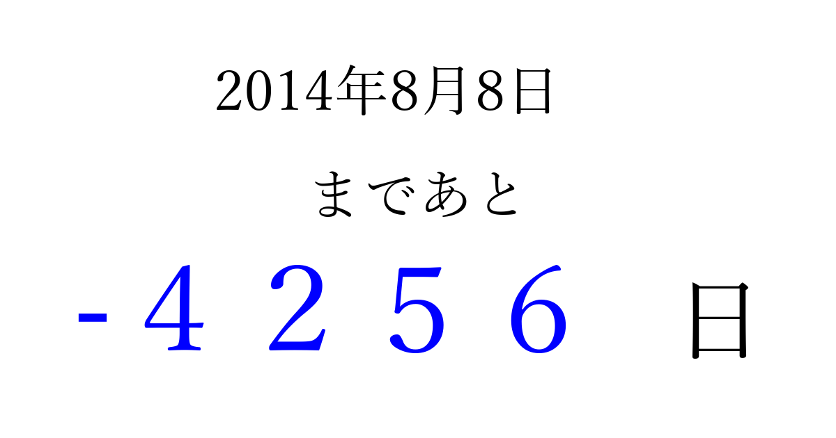 2014年8月8日(金)は もう 0000 日過ぎました 追加すると、トップページからすぐ選べるようになります ※2026/04/03現在の結果です。 最新の状態に更新する ↓シェアして、タイムライン上にカウントダウンを表示しよう!↓ 📤 この結果を共有する Tweet シェア Threads Bluesky 別の日付でカウントダウン 2014年8月のカレンダー このページをブックマークに追加すると、いつでもカウントダウンを確認できます。 (PC: Ctrl+D / Mac: ⌘+D) hitome-notes.comでは以下のページも運営しています。 指定日と期間から日付を計算 | ガチャ確率計算・シミュレーション | プライバシー・ポリシー 運営者:Avocado