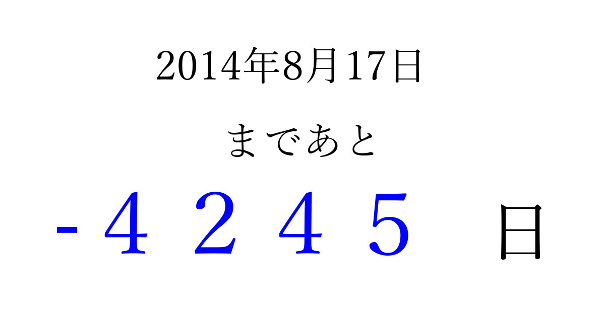 2014年8月17日(日)は もう 0000 日過ぎました 追加すると、トップページからすぐ選べるようになります ※2026/04/01現在の結果です。 最新の状態に更新する ↓シェアして、タイムライン上にカウントダウンを表示しよう!↓ 📤 この結果を共有する Tweet シェア Threads Bluesky 別の日付でカウントダウン 2014年8月のカレンダー このページをブックマークに追加すると、いつでもカウントダウンを確認できます。 (PC: Ctrl+D / Mac: ⌘+D) hitome-notes.comでは以下のページも運営しています。 指定日と期間から日付を計算 | ガチャ確率計算・シミュレーション | プライバシー・ポリシー 運営者:Avocado