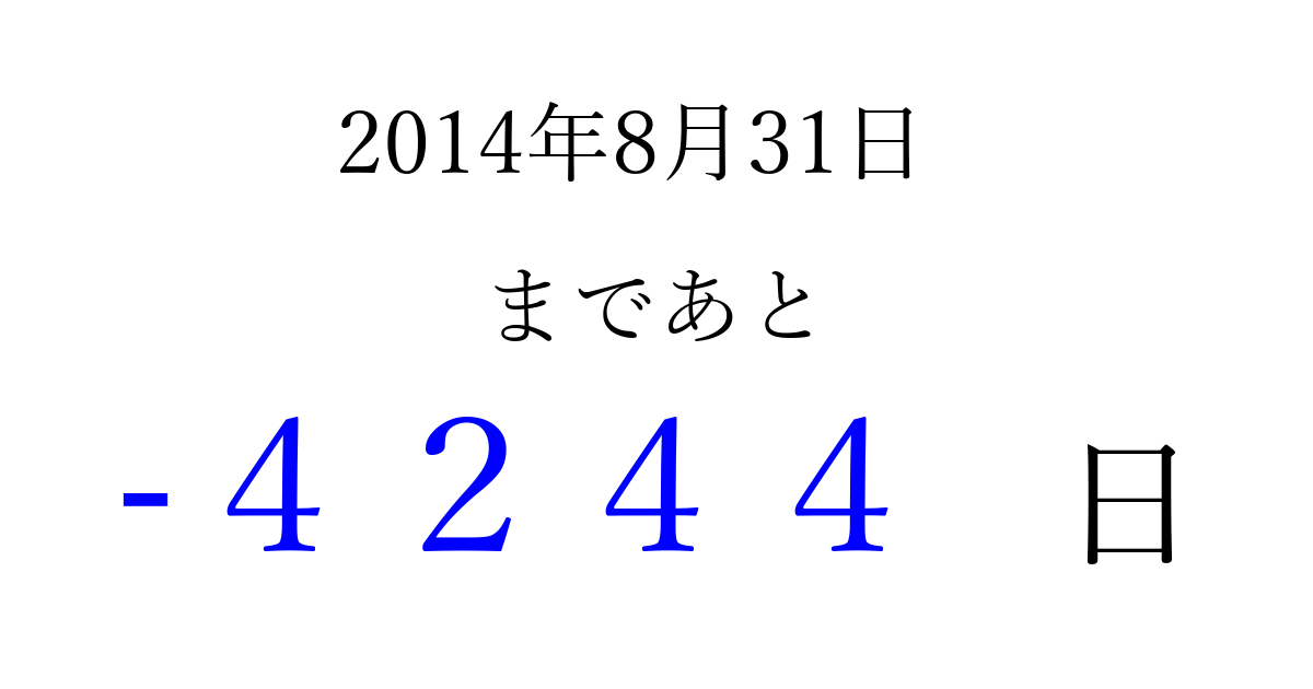 2014年8月31日(日)は もう 0000 日過ぎました 追加すると、トップページからすぐ選べるようになります ※2026/04/14現在の結果です。 最新の状態に更新する ↓シェアして、タイムライン上にカウントダウンを表示しよう!↓ 📤 この結果を共有する Tweet シェア Threads Bluesky 別の日付でカウントダウン 2014年8月のカレンダー このページをブックマークに追加すると、いつでもカウントダウンを確認できます。 (PC: Ctrl+D / Mac: ⌘+D) hitome-notes.comでは以下のページも運営しています。 指定日と期間から日付を計算 | ガチャ確率計算・シミュレーション | プライバシー・ポリシー 運営者:Avocado