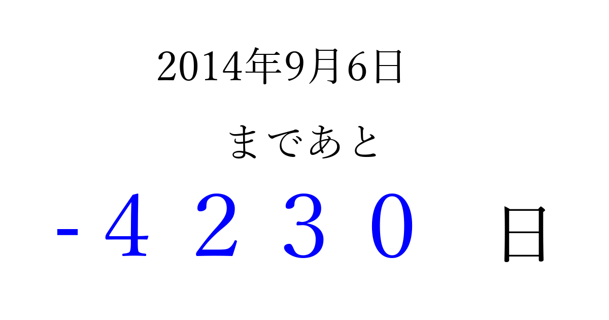 2014年9月6日(土)は もう 0000 日過ぎました 追加すると、トップページからすぐ選べるようになります ※2026/04/06現在の結果です。 最新の状態に更新する ↓シェアして、タイムライン上にカウントダウンを表示しよう!↓ 📤 この結果を共有する Tweet シェア Threads Bluesky 別の日付でカウントダウン 2014年9月のカレンダー このページをブックマークに追加すると、いつでもカウントダウンを確認できます。 (PC: Ctrl+D / Mac: ⌘+D) hitome-notes.comでは以下のページも運営しています。 指定日と期間から日付を計算 | ガチャ確率計算・シミュレーション | プライバシー・ポリシー 運営者:Avocado