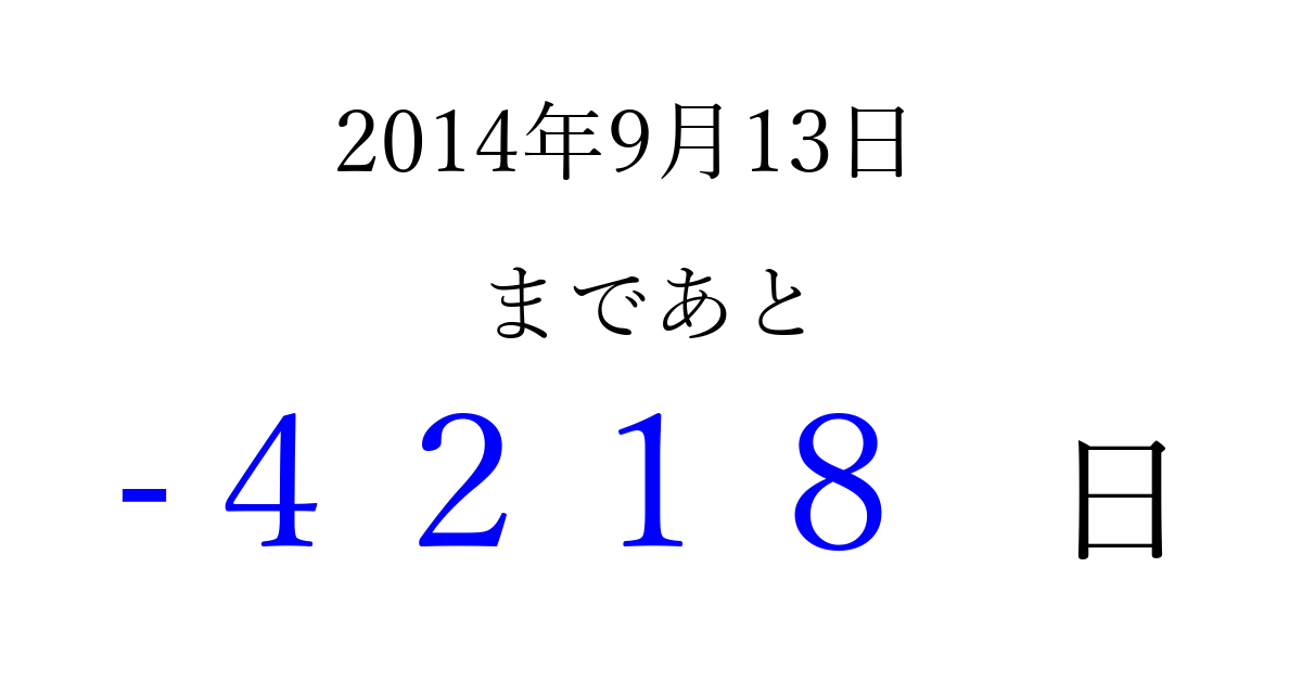 2014年9月13日(土)は もう 0000 日過ぎました 追加すると、トップページからすぐ選べるようになります ※2026/04/01現在の結果です。 最新の状態に更新する ↓シェアして、タイムライン上にカウントダウンを表示しよう!↓ 📤 この結果を共有する Tweet シェア Threads Bluesky 別の日付でカウントダウン 2014年9月のカレンダー このページをブックマークに追加すると、いつでもカウントダウンを確認できます。 (PC: Ctrl+D / Mac: ⌘+D) hitome-notes.comでは以下のページも運営しています。 指定日と期間から日付を計算 | ガチャ確率計算・シミュレーション | プライバシー・ポリシー 運営者:Avocado