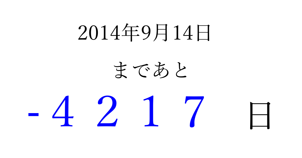 2014年9月14日(日)は もう 0000 日過ぎました 追加すると、トップページからすぐ選べるようになります ※2026/04/01現在の結果です。 最新の状態に更新する ↓シェアして、タイムライン上にカウントダウンを表示しよう!↓ 📤 この結果を共有する Tweet シェア Threads Bluesky 別の日付でカウントダウン 2014年9月のカレンダー このページをブックマークに追加すると、いつでもカウントダウンを確認できます。 (PC: Ctrl+D / Mac: ⌘+D) hitome-notes.comでは以下のページも運営しています。 指定日と期間から日付を計算 | ガチャ確率計算・シミュレーション | プライバシー・ポリシー 運営者:Avocado