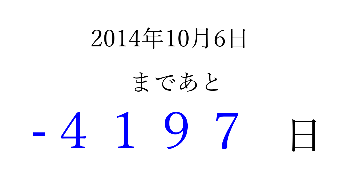 2014年10月6日(月)は もう 0000 日過ぎました 追加すると、トップページからすぐ選べるようになります ※2026/04/03現在の結果です。 最新の状態に更新する ↓シェアして、タイムライン上にカウントダウンを表示しよう!↓ 📤 この結果を共有する Tweet シェア Threads Bluesky 別の日付でカウントダウン 2014年10月のカレンダー このページをブックマークに追加すると、いつでもカウントダウンを確認できます。 (PC: Ctrl+D / Mac: ⌘+D) hitome-notes.comでは以下のページも運営しています。 指定日と期間から日付を計算 | ガチャ確率計算・シミュレーション | プライバシー・ポリシー 運営者:Avocado