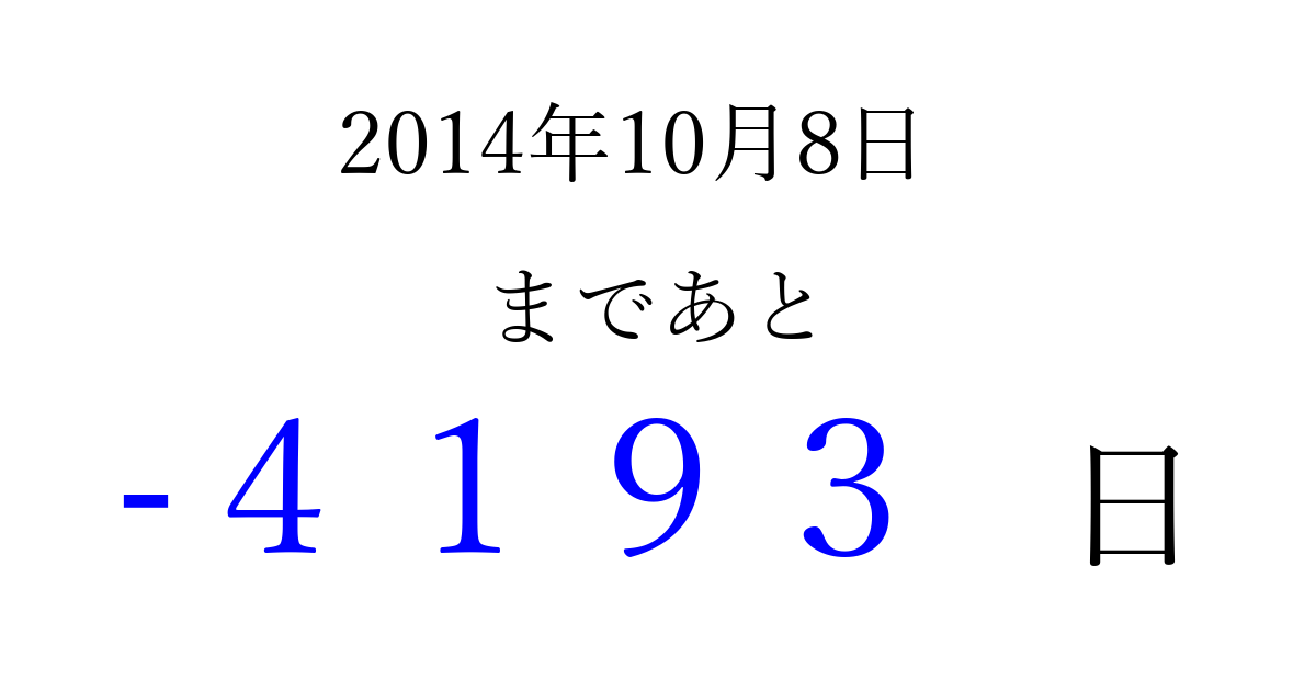 2014年10月8日(水)は もう 0000 日過ぎました 追加すると、トップページからすぐ選べるようになります ※2026/04/01現在の結果です。 最新の状態に更新する ↓シェアして、タイムライン上にカウントダウンを表示しよう!↓ 📤 この結果を共有する Tweet シェア Threads Bluesky 別の日付でカウントダウン 2014年10月のカレンダー このページをブックマークに追加すると、いつでもカウントダウンを確認できます。 (PC: Ctrl+D / Mac: ⌘+D) hitome-notes.comでは以下のページも運営しています。 指定日と期間から日付を計算 | ガチャ確率計算・シミュレーション | プライバシー・ポリシー 運営者:Avocado