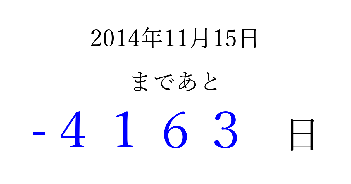 2014年11月15日(土)は もう 0000 日過ぎました 追加すると、トップページからすぐ選べるようになります ※2026/04/09現在の結果です。 最新の状態に更新する ↓シェアして、タイムライン上にカウントダウンを表示しよう!↓ 📤 この結果を共有する Tweet シェア Threads Bluesky 別の日付でカウントダウン 2014年11月のカレンダー このページをブックマークに追加すると、いつでもカウントダウンを確認できます。 (PC: Ctrl+D / Mac: ⌘+D) hitome-notes.comでは以下のページも運営しています。 指定日と期間から日付を計算 | ガチャ確率計算・シミュレーション | プライバシー・ポリシー 運営者:Avocado