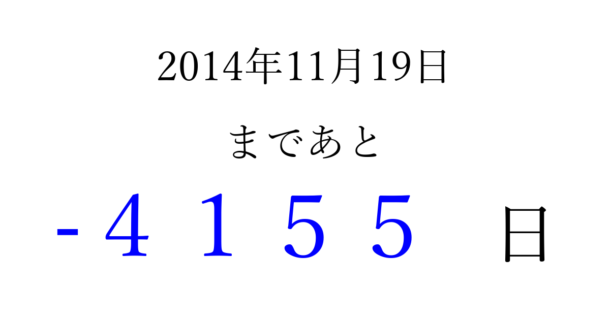 2014年11月19日(水)は もう 0000 日過ぎました 追加すると、トップページからすぐ選べるようになります ※2026/04/05現在の結果です。 最新の状態に更新する ↓シェアして、タイムライン上にカウントダウンを表示しよう!↓ 📤 この結果を共有する Tweet シェア Threads Bluesky 別の日付でカウントダウン 2014年11月のカレンダー このページをブックマークに追加すると、いつでもカウントダウンを確認できます。 (PC: Ctrl+D / Mac: ⌘+D) hitome-notes.comでは以下のページも運営しています。 指定日と期間から日付を計算 | ガチャ確率計算・シミュレーション | プライバシー・ポリシー 運営者:Avocado