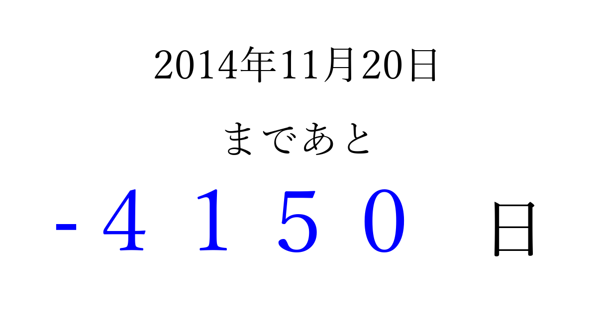 2014年11月20日(木)は もう 0000 日過ぎました 追加すると、トップページからすぐ選べるようになります ※2026/04/01現在の結果です。 最新の状態に更新する ↓シェアして、タイムライン上にカウントダウンを表示しよう!↓ 📤 この結果を共有する Tweet シェア Threads Bluesky 別の日付でカウントダウン 2014年11月のカレンダー このページをブックマークに追加すると、いつでもカウントダウンを確認できます。 (PC: Ctrl+D / Mac: ⌘+D) hitome-notes.comでは以下のページも運営しています。 指定日と期間から日付を計算 | ガチャ確率計算・シミュレーション | プライバシー・ポリシー 運営者:Avocado