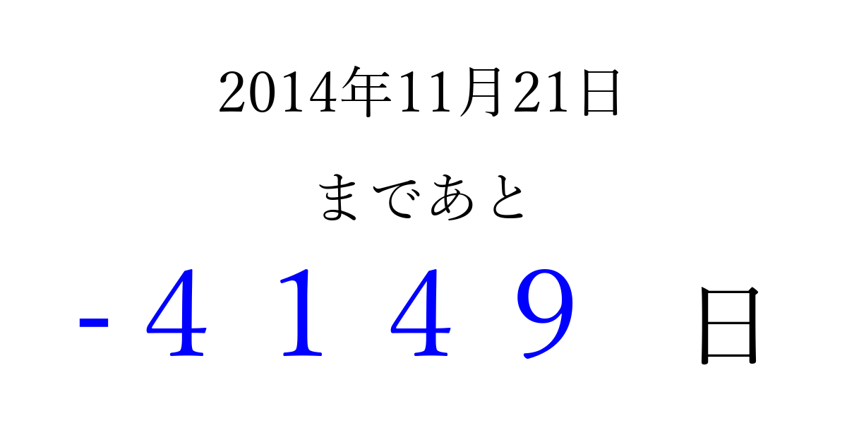 2014年11月21日(金)は もう 0000 日過ぎました 追加すると、トップページからすぐ選べるようになります ※2026/04/01現在の結果です。 最新の状態に更新する ↓シェアして、タイムライン上にカウントダウンを表示しよう!↓ 📤 この結果を共有する Tweet シェア Threads Bluesky 別の日付でカウントダウン 2014年11月のカレンダー このページをブックマークに追加すると、いつでもカウントダウンを確認できます。 (PC: Ctrl+D / Mac: ⌘+D) hitome-notes.comでは以下のページも運営しています。 指定日と期間から日付を計算 | ガチャ確率計算・シミュレーション | プライバシー・ポリシー 運営者:Avocado