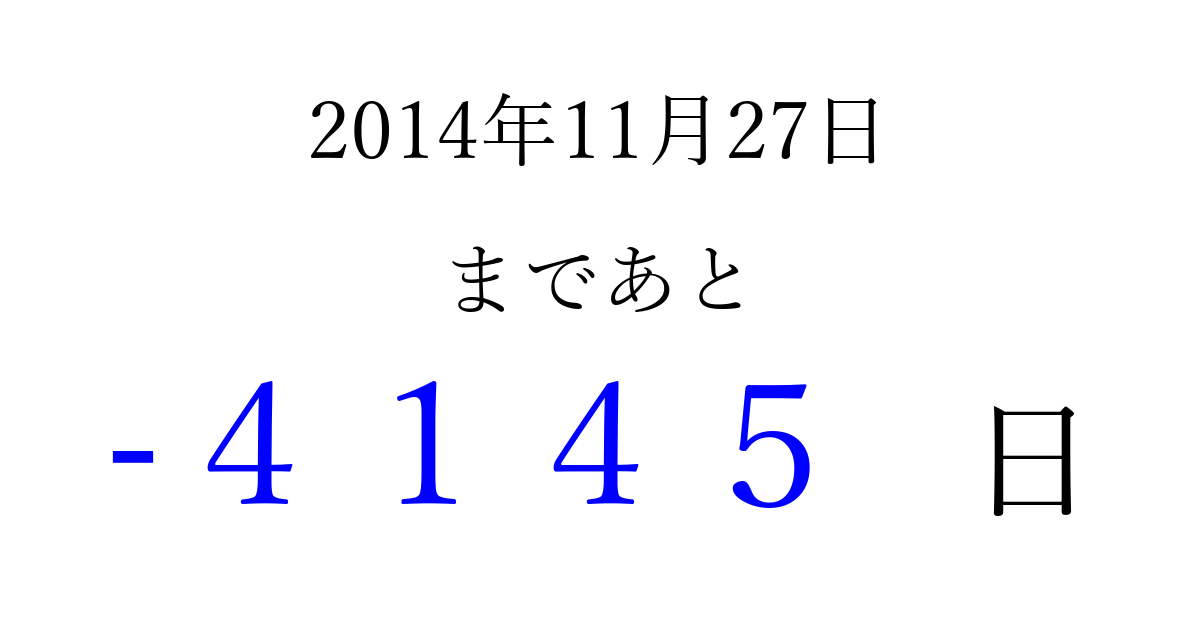 2014年11月27日(木)は もう 0000 日過ぎました 追加すると、トップページからすぐ選べるようになります ※2026/04/03現在の結果です。 最新の状態に更新する ↓シェアして、タイムライン上にカウントダウンを表示しよう!↓ 📤 この結果を共有する Tweet シェア Threads Bluesky 別の日付でカウントダウン 2014年11月のカレンダー このページをブックマークに追加すると、いつでもカウントダウンを確認できます。 (PC: Ctrl+D / Mac: ⌘+D) hitome-notes.comでは以下のページも運営しています。 指定日と期間から日付を計算 | ガチャ確率計算・シミュレーション | プライバシー・ポリシー 運営者:Avocado