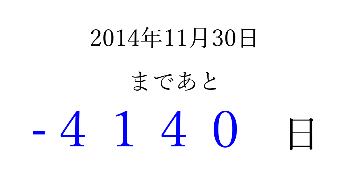 2014年11月30日(日)は もう 0000 日過ぎました 追加すると、トップページからすぐ選べるようになります ※2026/04/01現在の結果です。 最新の状態に更新する ↓シェアして、タイムライン上にカウントダウンを表示しよう!↓ 📤 この結果を共有する Tweet シェア Threads Bluesky 別の日付でカウントダウン 2014年11月のカレンダー このページをブックマークに追加すると、いつでもカウントダウンを確認できます。 (PC: Ctrl+D / Mac: ⌘+D) hitome-notes.comでは以下のページも運営しています。 指定日と期間から日付を計算 | ガチャ確率計算・シミュレーション | プライバシー・ポリシー 運営者:Avocado