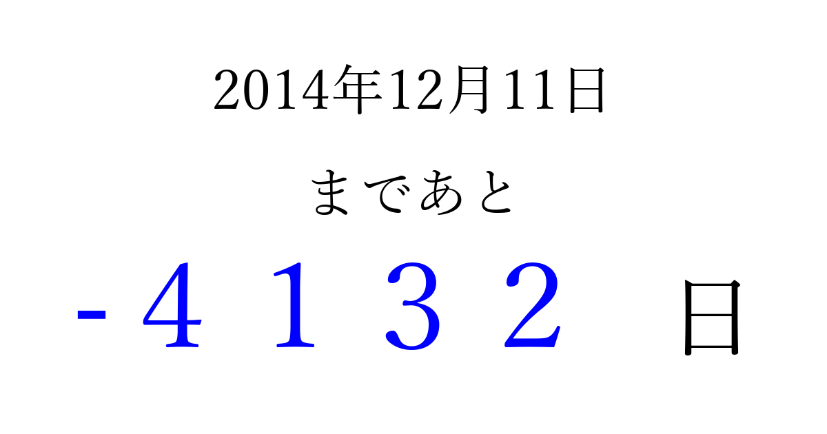 2014年12月11日(木)は もう 0000 日過ぎました 追加すると、トップページからすぐ選べるようになります ※2026/04/04現在の結果です。 最新の状態に更新する ↓シェアして、タイムライン上にカウントダウンを表示しよう!↓ 📤 この結果を共有する Tweet シェア Threads Bluesky 別の日付でカウントダウン 2014年12月のカレンダー このページをブックマークに追加すると、いつでもカウントダウンを確認できます。 (PC: Ctrl+D / Mac: ⌘+D) hitome-notes.comでは以下のページも運営しています。 指定日と期間から日付を計算 | ガチャ確率計算・シミュレーション | プライバシー・ポリシー 運営者:Avocado