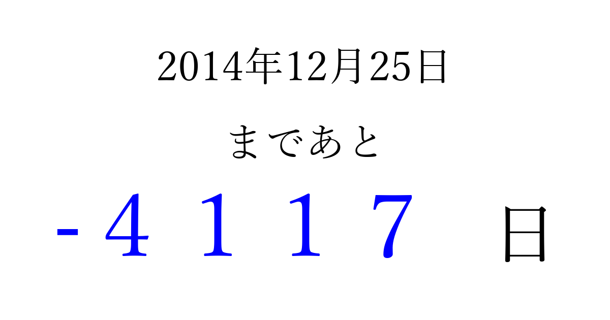 2014年12月25日(木)は もう 0000 日過ぎました 追加すると、トップページからすぐ選べるようになります ※2026/04/03現在の結果です。 最新の状態に更新する ↓シェアして、タイムライン上にカウントダウンを表示しよう!↓ 📤 この結果を共有する Tweet シェア Threads Bluesky 別の日付でカウントダウン 2014年12月のカレンダー このページをブックマークに追加すると、いつでもカウントダウンを確認できます。 (PC: Ctrl+D / Mac: ⌘+D) hitome-notes.comでは以下のページも運営しています。 指定日と期間から日付を計算 | ガチャ確率計算・シミュレーション | プライバシー・ポリシー 運営者:Avocado