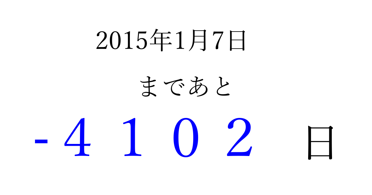 2015年1月7日(水)は もう 0000 日過ぎました 追加すると、トップページからすぐ選べるようになります ※2026/04/01現在の結果です。 最新の状態に更新する ↓シェアして、タイムライン上にカウントダウンを表示しよう!↓ 📤 この結果を共有する Tweet シェア Threads Bluesky 別の日付でカウントダウン 2015年1月のカレンダー このページをブックマークに追加すると、いつでもカウントダウンを確認できます。 (PC: Ctrl+D / Mac: ⌘+D) hitome-notes.comでは以下のページも運営しています。 指定日と期間から日付を計算 | ガチャ確率計算・シミュレーション | プライバシー・ポリシー 運営者:Avocado