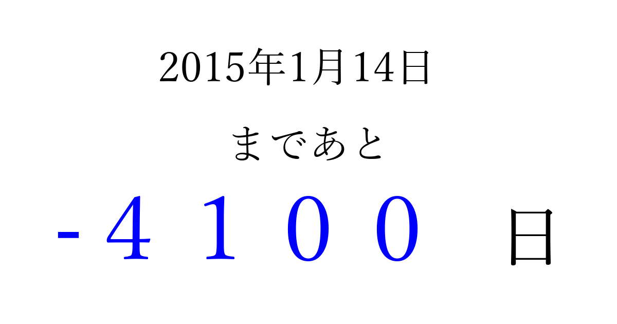 2015年1月14日(水)は もう 0000 日過ぎました 追加すると、トップページからすぐ選べるようになります ※2026/04/06現在の結果です。 最新の状態に更新する ↓シェアして、タイムライン上にカウントダウンを表示しよう!↓ 📤 この結果を共有する Tweet シェア Threads Bluesky 別の日付でカウントダウン 2015年1月のカレンダー このページをブックマークに追加すると、いつでもカウントダウンを確認できます。 (PC: Ctrl+D / Mac: ⌘+D) hitome-notes.comでは以下のページも運営しています。 指定日と期間から日付を計算 | ガチャ確率計算・シミュレーション | プライバシー・ポリシー 運営者:Avocado