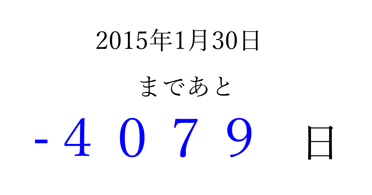 2015年1月30日(金)は もう 0000 日過ぎました 追加すると、トップページからすぐ選べるようになります ※2026/04/01現在の結果です。 最新の状態に更新する ↓シェアして、タイムライン上にカウントダウンを表示しよう!↓ 📤 この結果を共有する Tweet シェア Threads Bluesky 別の日付でカウントダウン 2015年1月のカレンダー このページをブックマークに追加すると、いつでもカウントダウンを確認できます。 (PC: Ctrl+D / Mac: ⌘+D) hitome-notes.comでは以下のページも運営しています。 指定日と期間から日付を計算 | ガチャ確率計算・シミュレーション | プライバシー・ポリシー 運営者:Avocado