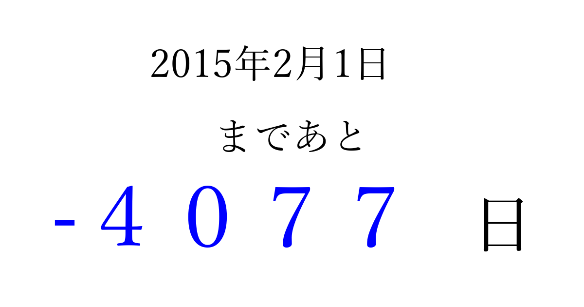 2015年2月1日(日)は もう 0000 日過ぎました 追加すると、トップページからすぐ選べるようになります ※2026/04/01現在の結果です。 最新の状態に更新する ↓シェアして、タイムライン上にカウントダウンを表示しよう!↓ 📤 この結果を共有する Tweet シェア Threads Bluesky 別の日付でカウントダウン 2015年2月のカレンダー このページをブックマークに追加すると、いつでもカウントダウンを確認できます。 (PC: Ctrl+D / Mac: ⌘+D) hitome-notes.comでは以下のページも運営しています。 指定日と期間から日付を計算 | ガチャ確率計算・シミュレーション | プライバシー・ポリシー 運営者:Avocado
