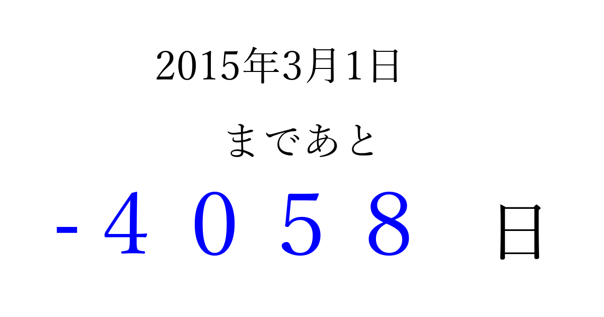 2015年3月1日(日)は もう 0000 日過ぎました 追加すると、トップページからすぐ選べるようになります ※2026/04/10現在の結果です。 最新の状態に更新する ↓シェアして、タイムライン上にカウントダウンを表示しよう!↓ 📤 この結果を共有する Tweet シェア Threads Bluesky 別の日付でカウントダウン 2015年3月のカレンダー このページをブックマークに追加すると、いつでもカウントダウンを確認できます。 (PC: Ctrl+D / Mac: ⌘+D) hitome-notes.comでは以下のページも運営しています。 指定日と期間から日付を計算 | ガチャ確率計算・シミュレーション | プライバシー・ポリシー 運営者:Avocado