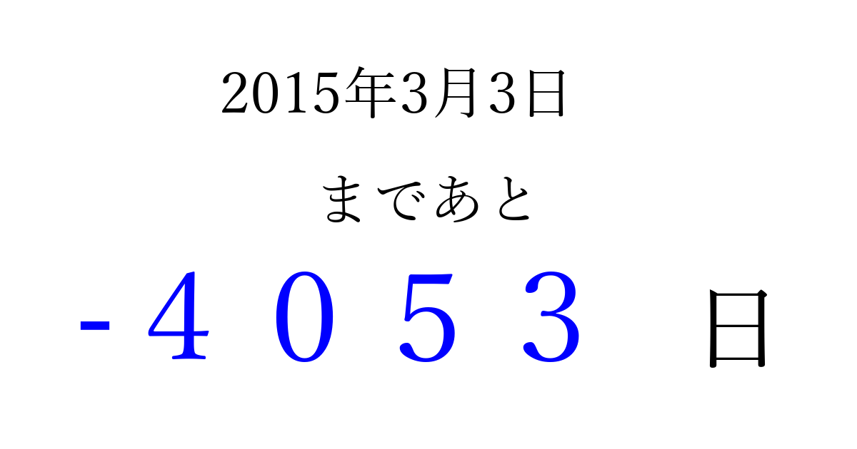 2015年3月3日(火)は もう 0000 日過ぎました 追加すると、トップページからすぐ選べるようになります ※2026/04/07現在の結果です。 最新の状態に更新する ↓シェアして、タイムライン上にカウントダウンを表示しよう!↓ 📤 この結果を共有する Tweet シェア Threads Bluesky 別の日付でカウントダウン 2015年3月のカレンダー このページをブックマークに追加すると、いつでもカウントダウンを確認できます。 (PC: Ctrl+D / Mac: ⌘+D) hitome-notes.comでは以下のページも運営しています。 指定日と期間から日付を計算 | ガチャ確率計算・シミュレーション | プライバシー・ポリシー 運営者:Avocado