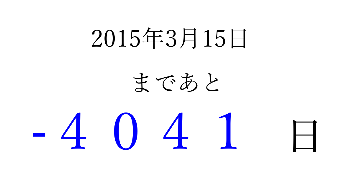 2015年3月15日(日)は もう 0000 日過ぎました 追加すると、トップページからすぐ選べるようになります ※2026/04/07現在の結果です。 最新の状態に更新する ↓シェアして、タイムライン上にカウントダウンを表示しよう!↓ 📤 この結果を共有する Tweet シェア Threads Bluesky 別の日付でカウントダウン 2015年3月のカレンダー このページをブックマークに追加すると、いつでもカウントダウンを確認できます。 (PC: Ctrl+D / Mac: ⌘+D) hitome-notes.comでは以下のページも運営しています。 指定日と期間から日付を計算 | ガチャ確率計算・シミュレーション | プライバシー・ポリシー 運営者:Avocado
