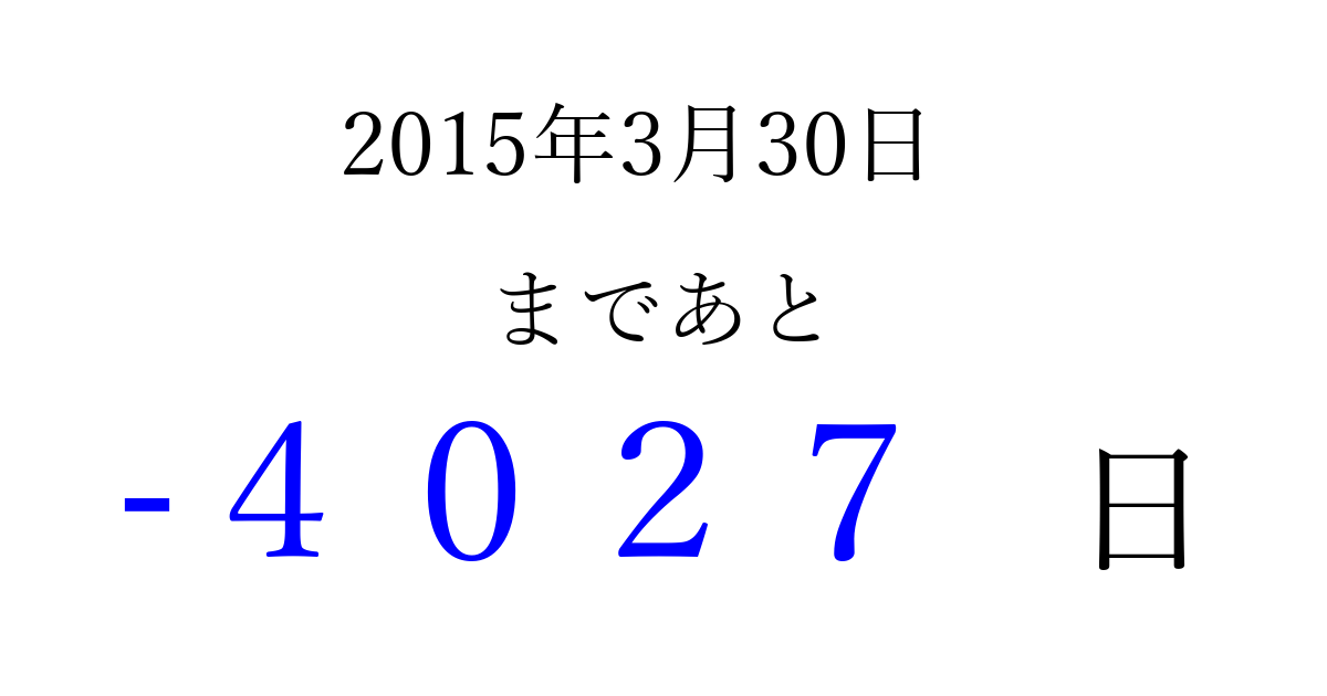 2015年3月30日(月)は もう 0000 日過ぎました 追加すると、トップページからすぐ選べるようになります ※2026/04/08現在の結果です。 最新の状態に更新する ↓シェアして、タイムライン上にカウントダウンを表示しよう!↓ 📤 この結果を共有する Tweet シェア Threads Bluesky 別の日付でカウントダウン 2015年3月のカレンダー このページをブックマークに追加すると、いつでもカウントダウンを確認できます。 (PC: Ctrl+D / Mac: ⌘+D) hitome-notes.comでは以下のページも運営しています。 指定日と期間から日付を計算 | ガチャ確率計算・シミュレーション | プライバシー・ポリシー 運営者:Avocado