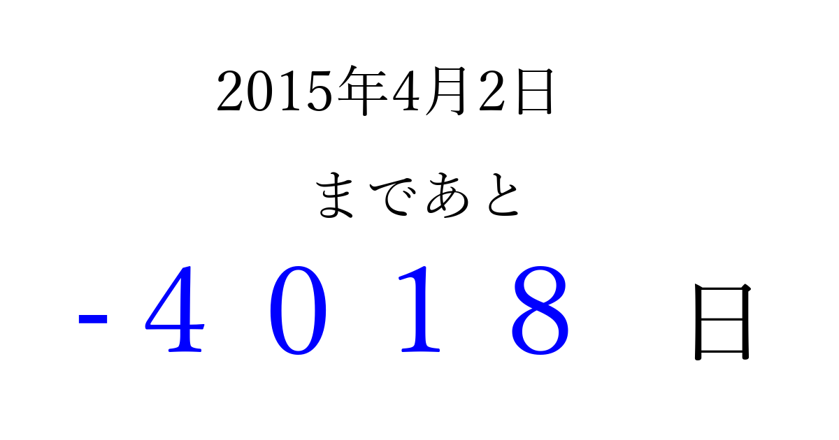 2015年4月2日(木)は もう 0000 日過ぎました 追加すると、トップページからすぐ選べるようになります ※2026/04/02現在の結果です。 最新の状態に更新する ↓シェアして、タイムライン上にカウントダウンを表示しよう!↓ 📤 この結果を共有する Tweet シェア Threads Bluesky 別の日付でカウントダウン 2015年4月のカレンダー このページをブックマークに追加すると、いつでもカウントダウンを確認できます。 (PC: Ctrl+D / Mac: ⌘+D) hitome-notes.comでは以下のページも運営しています。 指定日と期間から日付を計算 | ガチャ確率計算・シミュレーション | プライバシー・ポリシー 運営者:Avocado