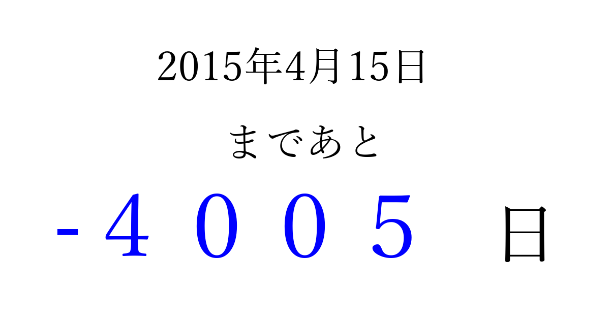 2015年4月15日(水)は もう 0000 日過ぎました 追加すると、トップページからすぐ選べるようになります ※2026/04/02現在の結果です。 最新の状態に更新する ↓シェアして、タイムライン上にカウントダウンを表示しよう!↓ 📤 この結果を共有する Tweet シェア Threads Bluesky 別の日付でカウントダウン 2015年4月のカレンダー このページをブックマークに追加すると、いつでもカウントダウンを確認できます。 (PC: Ctrl+D / Mac: ⌘+D) hitome-notes.comでは以下のページも運営しています。 指定日と期間から日付を計算 | ガチャ確率計算・シミュレーション | プライバシー・ポリシー 運営者:Avocado
