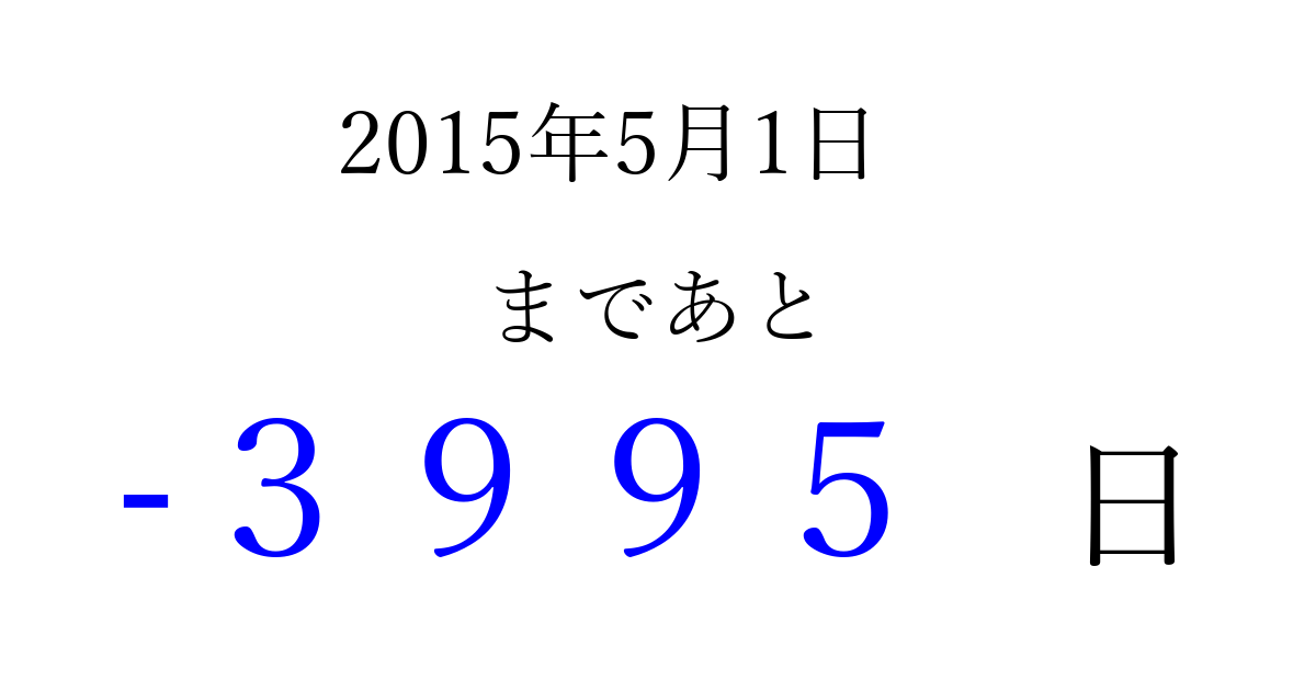 2015年5月1日(金)は もう 0000 日過ぎました 追加すると、トップページからすぐ選べるようになります ※2026/04/08現在の結果です。 最新の状態に更新する ↓シェアして、タイムライン上にカウントダウンを表示しよう!↓ 📤 この結果を共有する Tweet シェア Threads Bluesky 別の日付でカウントダウン 2015年5月のカレンダー このページをブックマークに追加すると、いつでもカウントダウンを確認できます。 (PC: Ctrl+D / Mac: ⌘+D) hitome-notes.comでは以下のページも運営しています。 指定日と期間から日付を計算 | ガチャ確率計算・シミュレーション | プライバシー・ポリシー 運営者:Avocado