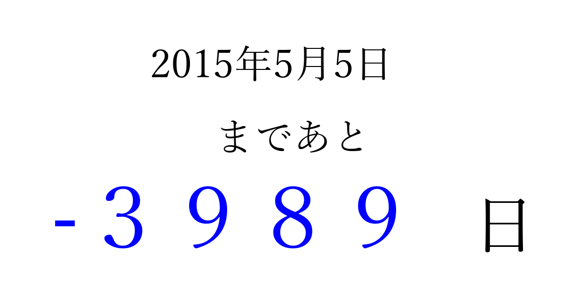 2015年5月5日(火)は もう 0000 日過ぎました 追加すると、トップページからすぐ選べるようになります ※2026/04/06現在の結果です。 最新の状態に更新する ↓シェアして、タイムライン上にカウントダウンを表示しよう!↓ 📤 この結果を共有する Tweet シェア Threads Bluesky 別の日付でカウントダウン 2015年5月のカレンダー このページをブックマークに追加すると、いつでもカウントダウンを確認できます。 (PC: Ctrl+D / Mac: ⌘+D) hitome-notes.comでは以下のページも運営しています。 指定日と期間から日付を計算 | ガチャ確率計算・シミュレーション | プライバシー・ポリシー 運営者:Avocado