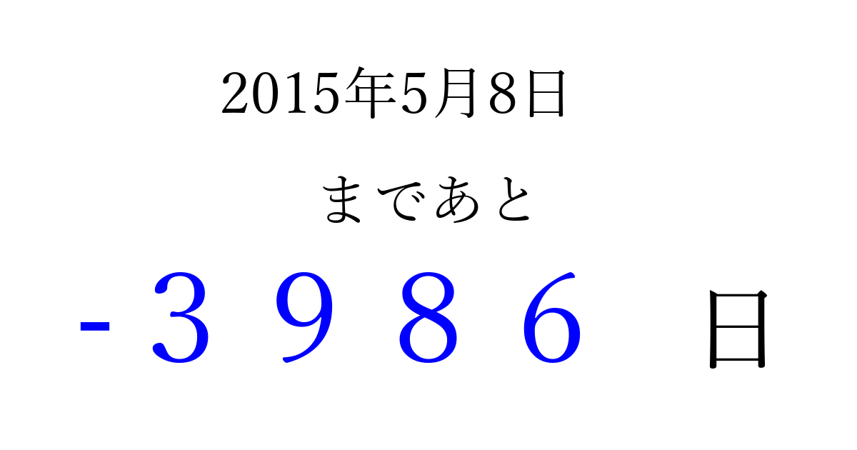 2015年5月8日(金)は もう 0000 日過ぎました 追加すると、トップページからすぐ選べるようになります ※2026/04/06現在の結果です。 最新の状態に更新する ↓シェアして、タイムライン上にカウントダウンを表示しよう!↓ 📤 この結果を共有する Tweet シェア Threads Bluesky 別の日付でカウントダウン 2015年5月のカレンダー このページをブックマークに追加すると、いつでもカウントダウンを確認できます。 (PC: Ctrl+D / Mac: ⌘+D) hitome-notes.comでは以下のページも運営しています。 指定日と期間から日付を計算 | ガチャ確率計算・シミュレーション | プライバシー・ポリシー 運営者:Avocado