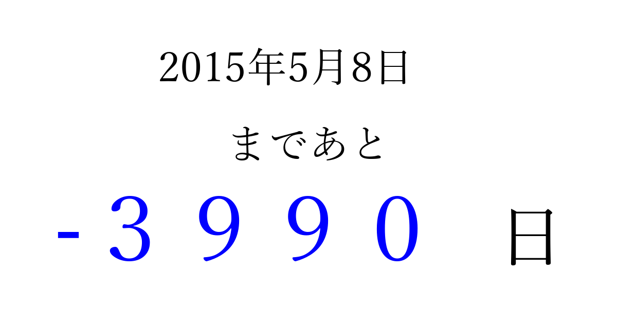 2015年5月8日(金)は もう 0000 日過ぎました 追加すると、トップページからすぐ選べるようになります ※2026/04/10現在の結果です。 最新の状態に更新する ↓シェアして、タイムライン上にカウントダウンを表示しよう!↓ 📤 この結果を共有する Tweet シェア Threads Bluesky 別の日付でカウントダウン 2015年5月のカレンダー このページをブックマークに追加すると、いつでもカウントダウンを確認できます。 (PC: Ctrl+D / Mac: ⌘+D) hitome-notes.comでは以下のページも運営しています。 指定日と期間から日付を計算 | ガチャ確率計算・シミュレーション | プライバシー・ポリシー 運営者:Avocado
