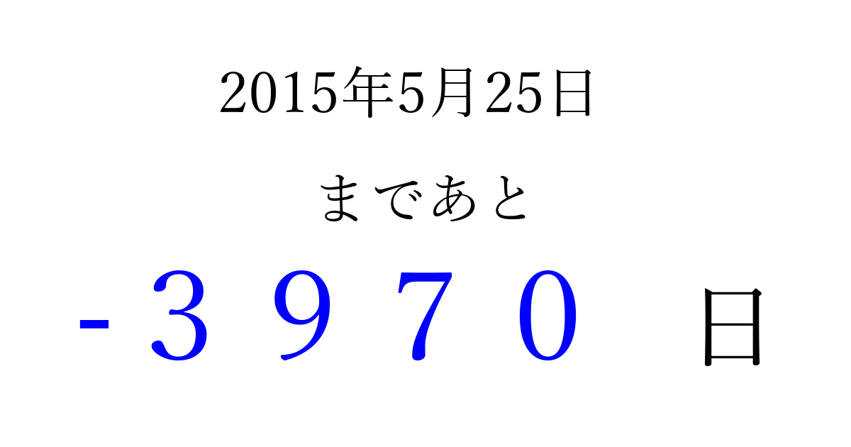2015年5月25日(月)は もう 0000 日過ぎました 追加すると、トップページからすぐ選べるようになります ※2026/04/07現在の結果です。 最新の状態に更新する ↓シェアして、タイムライン上にカウントダウンを表示しよう!↓ 📤 この結果を共有する Tweet シェア Threads Bluesky 別の日付でカウントダウン 2015年5月のカレンダー このページをブックマークに追加すると、いつでもカウントダウンを確認できます。 (PC: Ctrl+D / Mac: ⌘+D) hitome-notes.comでは以下のページも運営しています。 指定日と期間から日付を計算 | ガチャ確率計算・シミュレーション | プライバシー・ポリシー 運営者:Avocado
