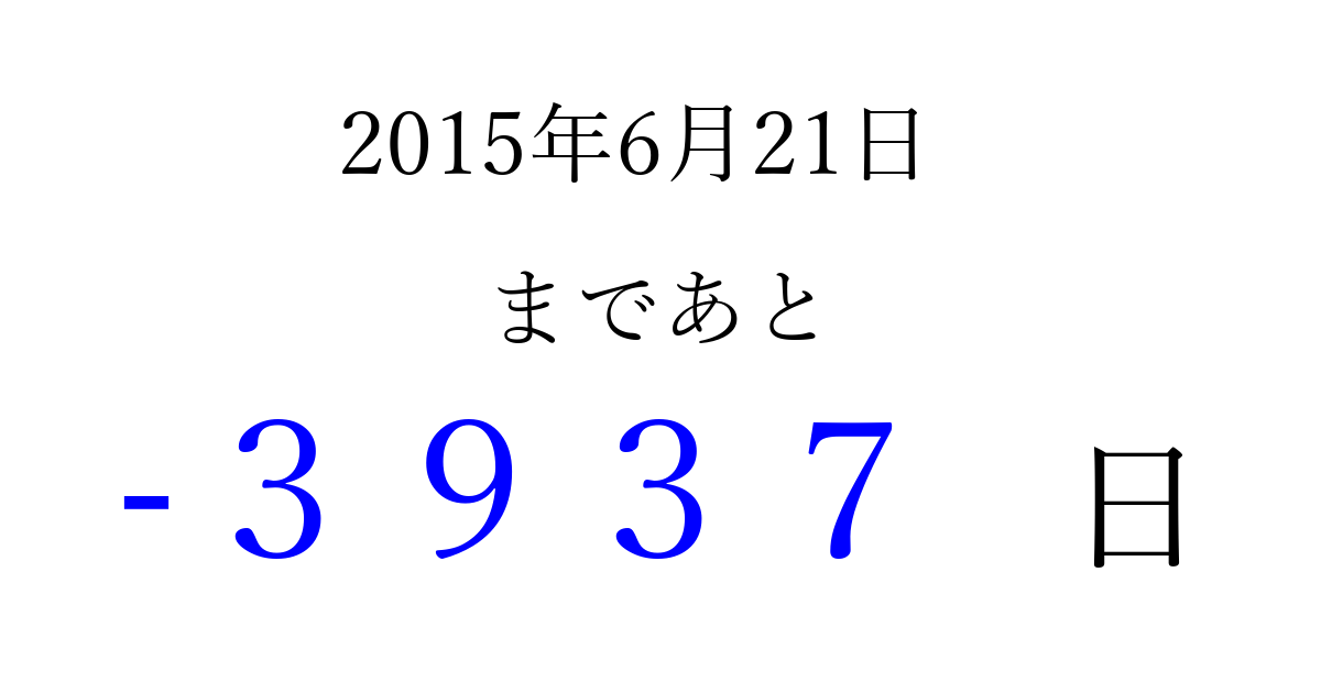 2015年6月21日(日)は もう 0000 日過ぎました 追加すると、トップページからすぐ選べるようになります ※2026/04/01現在の結果です。 最新の状態に更新する ↓シェアして、タイムライン上にカウントダウンを表示しよう!↓ 📤 この結果を共有する Tweet シェア Threads Bluesky 別の日付でカウントダウン 2015年6月のカレンダー このページをブックマークに追加すると、いつでもカウントダウンを確認できます。 (PC: Ctrl+D / Mac: ⌘+D) hitome-notes.comでは以下のページも運営しています。 指定日と期間から日付を計算 | ガチャ確率計算・シミュレーション | プライバシー・ポリシー 運営者:Avocado