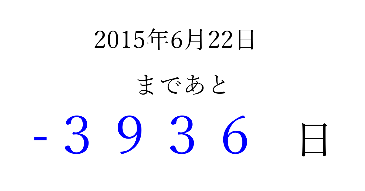 2015年6月22日(月)は もう 0000 日過ぎました 追加すると、トップページからすぐ選べるようになります ※2026/04/01現在の結果です。 最新の状態に更新する ↓シェアして、タイムライン上にカウントダウンを表示しよう!↓ 📤 この結果を共有する Tweet シェア Threads Bluesky 別の日付でカウントダウン 2015年6月のカレンダー このページをブックマークに追加すると、いつでもカウントダウンを確認できます。 (PC: Ctrl+D / Mac: ⌘+D) hitome-notes.comでは以下のページも運営しています。 指定日と期間から日付を計算 | ガチャ確率計算・シミュレーション | プライバシー・ポリシー 運営者:Avocado