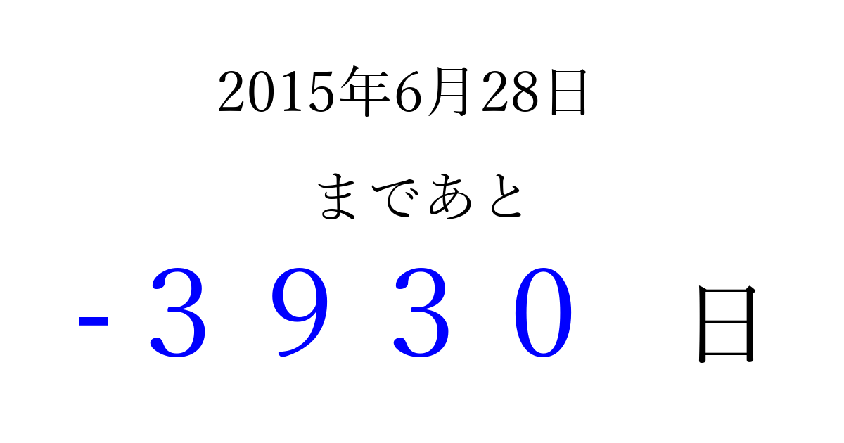 2015年6月28日(日)は もう 0000 日過ぎました 追加すると、トップページからすぐ選べるようになります ※2026/04/01現在の結果です。 最新の状態に更新する ↓シェアして、タイムライン上にカウントダウンを表示しよう!↓ 📤 この結果を共有する Tweet シェア Threads Bluesky 別の日付でカウントダウン 2015年6月のカレンダー このページをブックマークに追加すると、いつでもカウントダウンを確認できます。 (PC: Ctrl+D / Mac: ⌘+D) hitome-notes.comでは以下のページも運営しています。 指定日と期間から日付を計算 | ガチャ確率計算・シミュレーション | プライバシー・ポリシー 運営者:Avocado