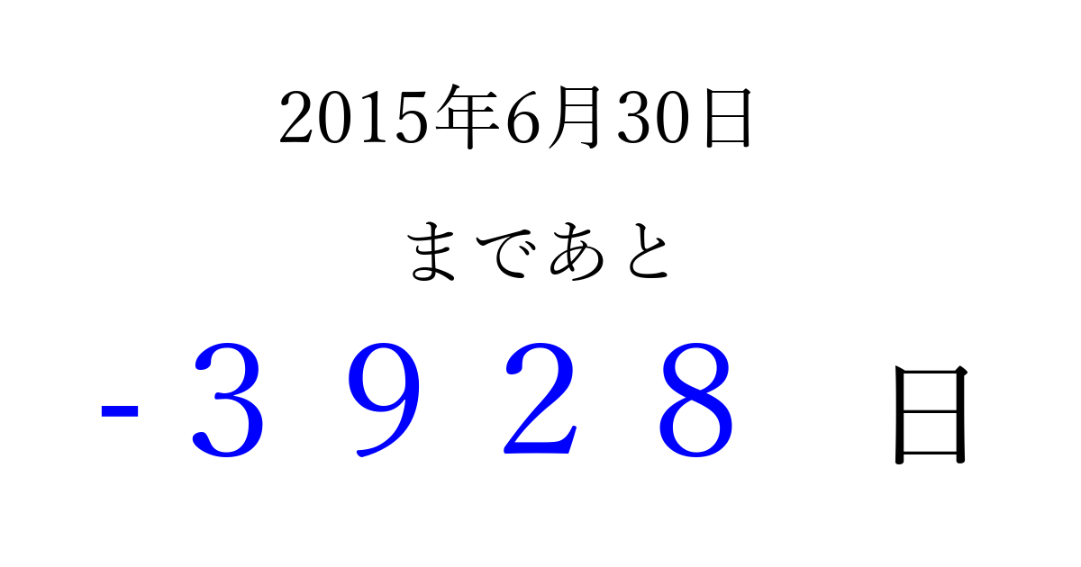 2015年6月30日(火)は もう 0000 日過ぎました 追加すると、トップページからすぐ選べるようになります ※2026/04/01現在の結果です。 最新の状態に更新する ↓シェアして、タイムライン上にカウントダウンを表示しよう!↓ 📤 この結果を共有する Tweet シェア Threads Bluesky 別の日付でカウントダウン 2015年6月のカレンダー このページをブックマークに追加すると、いつでもカウントダウンを確認できます。 (PC: Ctrl+D / Mac: ⌘+D) hitome-notes.comでは以下のページも運営しています。 指定日と期間から日付を計算 | ガチャ確率計算・シミュレーション | プライバシー・ポリシー 運営者:Avocado