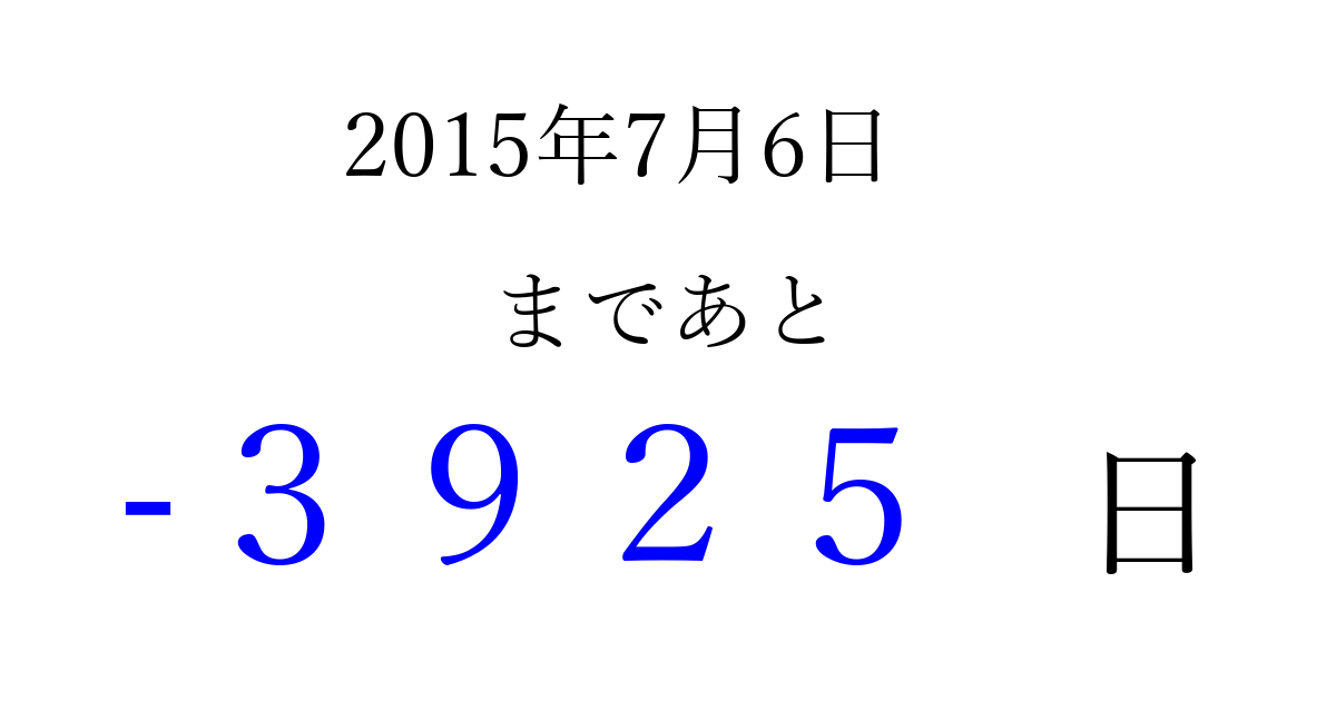 2015年7月6日(月)は もう 0000 日過ぎました 追加すると、トップページからすぐ選べるようになります ※2026/04/04現在の結果です。 最新の状態に更新する ↓シェアして、タイムライン上にカウントダウンを表示しよう!↓ 📤 この結果を共有する Tweet シェア Threads Bluesky 別の日付でカウントダウン 2015年7月のカレンダー このページをブックマークに追加すると、いつでもカウントダウンを確認できます。 (PC: Ctrl+D / Mac: ⌘+D) hitome-notes.comでは以下のページも運営しています。 指定日と期間から日付を計算 | ガチャ確率計算・シミュレーション | プライバシー・ポリシー 運営者:Avocado