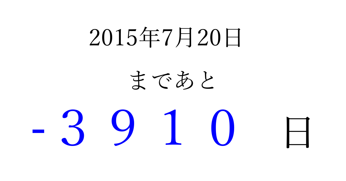 2015年7月20日(月)は もう 0000 日過ぎました 追加すると、トップページからすぐ選べるようになります ※2026/04/03現在の結果です。 最新の状態に更新する ↓シェアして、タイムライン上にカウントダウンを表示しよう!↓ 📤 この結果を共有する Tweet シェア Threads Bluesky 別の日付でカウントダウン 2015年7月のカレンダー このページをブックマークに追加すると、いつでもカウントダウンを確認できます。 (PC: Ctrl+D / Mac: ⌘+D) hitome-notes.comでは以下のページも運営しています。 指定日と期間から日付を計算 | ガチャ確率計算・シミュレーション | プライバシー・ポリシー 運営者:Avocado