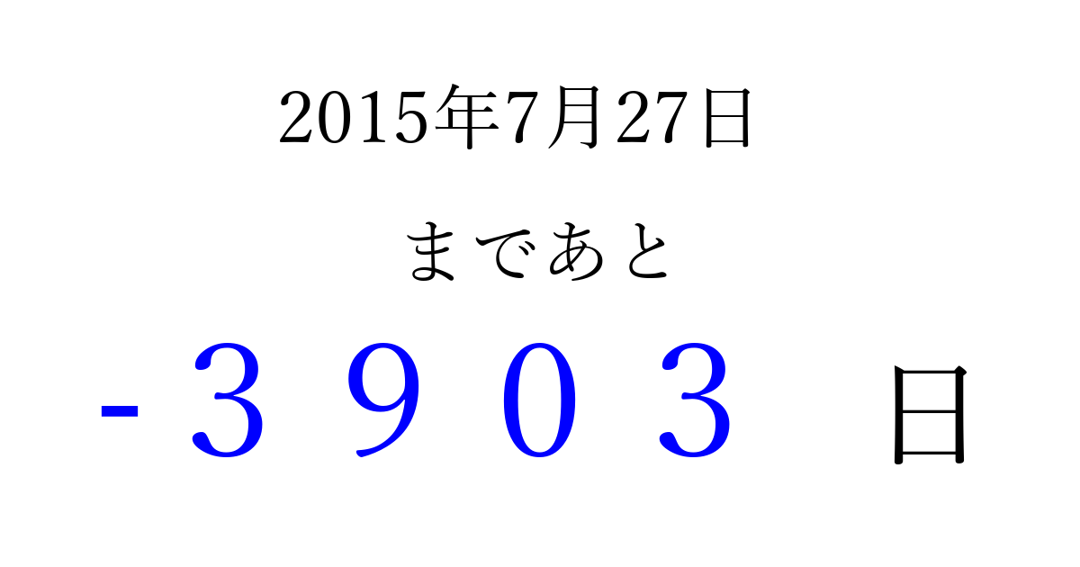 2015年7月27日(月)は もう 0000 日過ぎました 追加すると、トップページからすぐ選べるようになります ※2026/04/03現在の結果です。 最新の状態に更新する ↓シェアして、タイムライン上にカウントダウンを表示しよう!↓ 📤 この結果を共有する Tweet シェア Threads Bluesky 別の日付でカウントダウン 2015年7月のカレンダー このページをブックマークに追加すると、いつでもカウントダウンを確認できます。 (PC: Ctrl+D / Mac: ⌘+D) hitome-notes.comでは以下のページも運営しています。 指定日と期間から日付を計算 | ガチャ確率計算・シミュレーション | プライバシー・ポリシー 運営者:Avocado