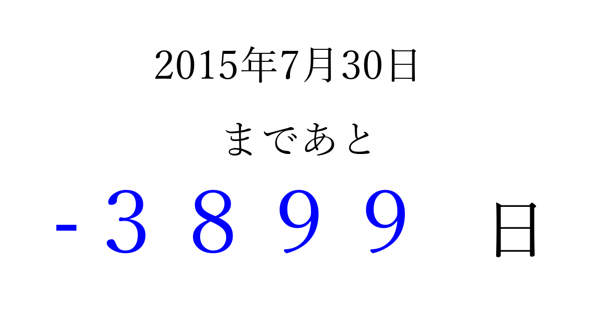 2015年7月30日(木)は もう 0000 日過ぎました 追加すると、トップページからすぐ選べるようになります ※2026/04/02現在の結果です。 最新の状態に更新する ↓シェアして、タイムライン上にカウントダウンを表示しよう!↓ 📤 この結果を共有する Tweet シェア Threads Bluesky 別の日付でカウントダウン 2015年7月のカレンダー このページをブックマークに追加すると、いつでもカウントダウンを確認できます。 (PC: Ctrl+D / Mac: ⌘+D) hitome-notes.comでは以下のページも運営しています。 指定日と期間から日付を計算 | ガチャ確率計算・シミュレーション | プライバシー・ポリシー 運営者:Avocado