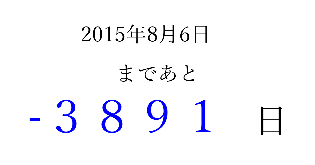 2015年8月6日(木)は もう 0000 日過ぎました 追加すると、トップページからすぐ選べるようになります ※2026/04/01現在の結果です。 最新の状態に更新する ↓シェアして、タイムライン上にカウントダウンを表示しよう!↓ 📤 この結果を共有する Tweet シェア Threads Bluesky 別の日付でカウントダウン 2015年8月のカレンダー このページをブックマークに追加すると、いつでもカウントダウンを確認できます。 (PC: Ctrl+D / Mac: ⌘+D) hitome-notes.comでは以下のページも運営しています。 指定日と期間から日付を計算 | ガチャ確率計算・シミュレーション | プライバシー・ポリシー 運営者:Avocado