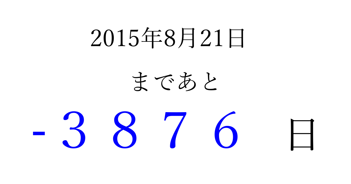 2015年8月21日(金)は もう 0000 日過ぎました 追加すると、トップページからすぐ選べるようになります ※2026/04/01現在の結果です。 最新の状態に更新する ↓シェアして、タイムライン上にカウントダウンを表示しよう!↓ 📤 この結果を共有する Tweet シェア Threads Bluesky 別の日付でカウントダウン 2015年8月のカレンダー このページをブックマークに追加すると、いつでもカウントダウンを確認できます。 (PC: Ctrl+D / Mac: ⌘+D) hitome-notes.comでは以下のページも運営しています。 指定日と期間から日付を計算 | ガチャ確率計算・シミュレーション | プライバシー・ポリシー 運営者:Avocado