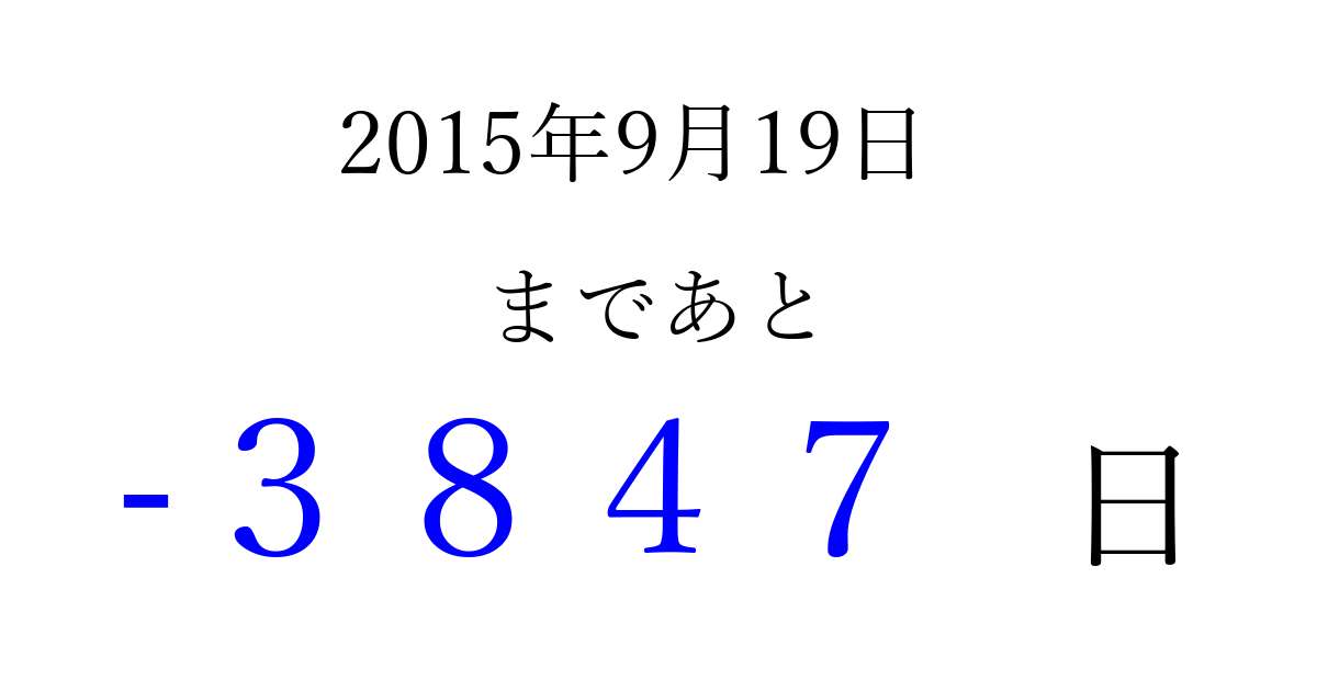 2015年9月19日(土)は もう 0000 日過ぎました 追加すると、トップページからすぐ選べるようになります ※2026/04/01現在の結果です。 最新の状態に更新する ↓シェアして、タイムライン上にカウントダウンを表示しよう!↓ 📤 この結果を共有する Tweet シェア Threads Bluesky 別の日付でカウントダウン 2015年9月のカレンダー このページをブックマークに追加すると、いつでもカウントダウンを確認できます。 (PC: Ctrl+D / Mac: ⌘+D) hitome-notes.comでは以下のページも運営しています。 指定日と期間から日付を計算 | ガチャ確率計算・シミュレーション | プライバシー・ポリシー 運営者:Avocado
