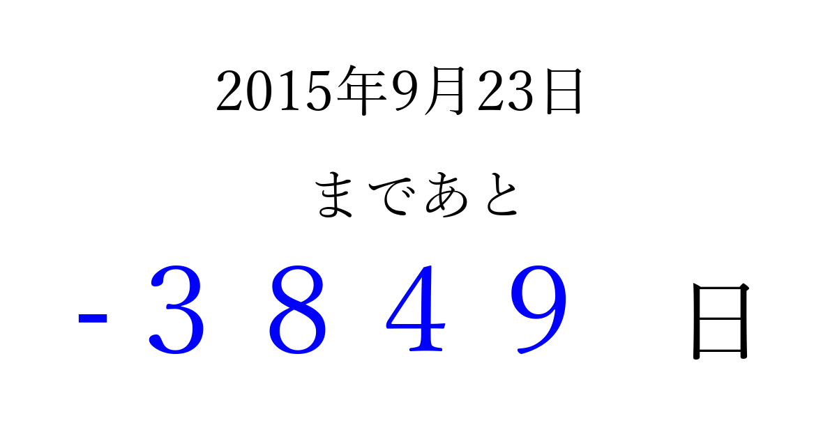 2015年9月23日(水)は もう 0000 日過ぎました 追加すると、トップページからすぐ選べるようになります ※2026/04/07現在の結果です。 最新の状態に更新する ↓シェアして、タイムライン上にカウントダウンを表示しよう!↓ 📤 この結果を共有する Tweet シェア Threads Bluesky 別の日付でカウントダウン 2015年9月のカレンダー このページをブックマークに追加すると、いつでもカウントダウンを確認できます。 (PC: Ctrl+D / Mac: ⌘+D) hitome-notes.comでは以下のページも運営しています。 指定日と期間から日付を計算 | ガチャ確率計算・シミュレーション | プライバシー・ポリシー 運営者:Avocado