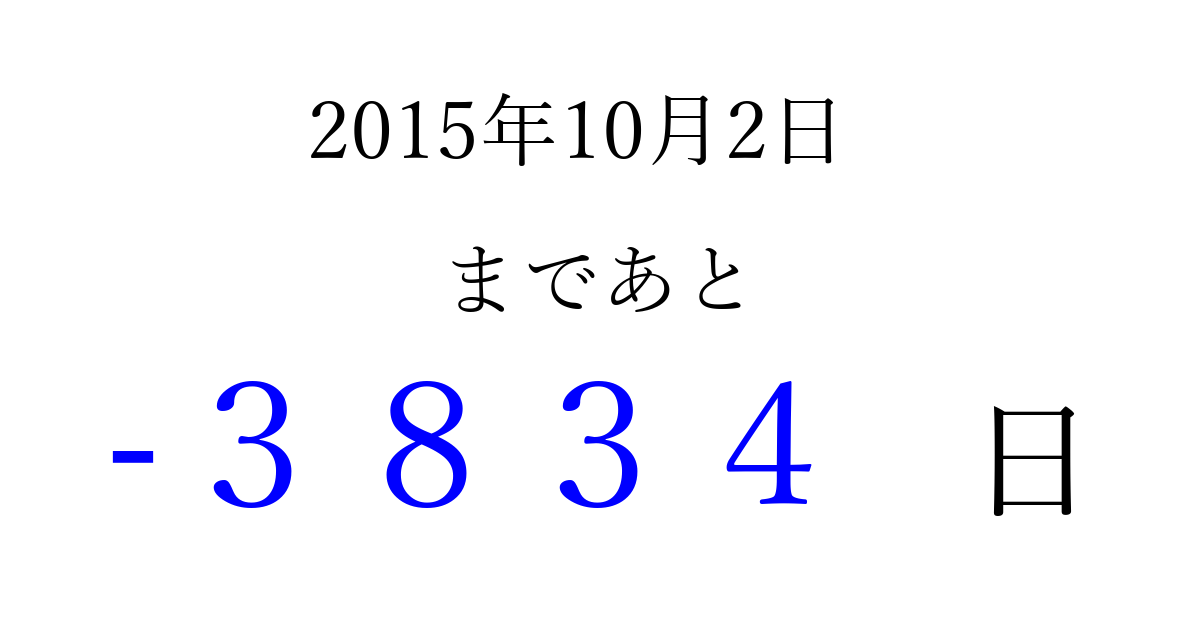 2015年10月2日(金)は もう 0000 日過ぎました 追加すると、トップページからすぐ選べるようになります ※2026/04/01現在の結果です。 最新の状態に更新する ↓シェアして、タイムライン上にカウントダウンを表示しよう!↓ 📤 この結果を共有する Tweet シェア Threads Bluesky 別の日付でカウントダウン 2015年10月のカレンダー このページをブックマークに追加すると、いつでもカウントダウンを確認できます。 (PC: Ctrl+D / Mac: ⌘+D) hitome-notes.comでは以下のページも運営しています。 指定日と期間から日付を計算 | ガチャ確率計算・シミュレーション | プライバシー・ポリシー 運営者:Avocado